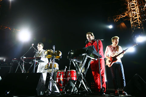 ネクストM.I.A.などと囁かれる話題のアメリカン・ガール。どんだけヒップなお方なのかしっかり確認せねば、と乗り込んだ〈DANCE STAGE〉。まずステージには、オモロそうな面々が並んでいた。蝶ネクタイのバンド・メンバーに無表情なダンサー2名。そこに主役であるキラキラしたブルーの衣装に身を包んだサントゴールド嬢。まずヴィジュアル面でこちらのハートをガッチリ掴んでくれました。“You’ll Find A Way”や“Say Aha”といったキャッチーなナンバーを矢継ぎ早に披露していく彼女とそのバンド。時にニューウェイヴィーだったり、ガール・ポップ・チックだったり、ダンスホール風だったりとファースト・アルバム『Santogold』の世界観の如く、出てくるサウンドは万華鏡的。さて、その指揮官であるサントゴールドは期待以上の暴れっぷりを見せてくれたわけが、新人らしい初々しさは全然なく、どっしりとした貫禄を放っていたのが印象的であった。聞けば、バンドを従えてのライヴを始めたばかりだという彼女。そのせいか今回のステージではトチリも何回か見られたけど、指揮官として力を高めて、よりオモロい集団を築いていってほしい、などと最後に付け加えておこう。*桑原