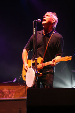 この熱い感じ……言い換えれば、闘争心ってことになるのか。〈いま〉という時間と格闘を続ける男(50歳)の叫びっつうものが、一日目の〈SONIC STAGE〉のラスト・ステージにはこだましていた。先頃、大作『22 Dreams』をリリースし、果たしてこの人に創作意欲の衰えというものがおとずれることってあるのだろうか?とファンに感嘆の声を上げさせたポール・ウェラー。その新作を引っさげての〈サマソニ〉参加となったわけだが、結論から言うと、狂おしいほどのロック魂を迸らせたステージを繰り広げてくれたのである。渋くてアーシーだけど、アグレッシヴでパンク精神を孕んだサウンドを叩きつけるこの大ヴェテラン(50歳)。“The Changingman”“Wild Wood”といった名曲が熱っぽく響き渡り、こちらの耳を激しく打った。また、終盤に披露された“The Eton Rifles”、アンコールで飛び出した“Town Colled Malice”というジャム時代のナンバーは会場の大合唱を誘ったが、それよりも新作からのナンバー、“Echoes Round The Sun”などが放つ生々しい響きのほうが個人的には胸に残っている。新しく誕生したそれらの曲が舞台上で目いっぱい躍動している様がとても頼もしく思えたのである。誠に素晴らしかった。*桑原