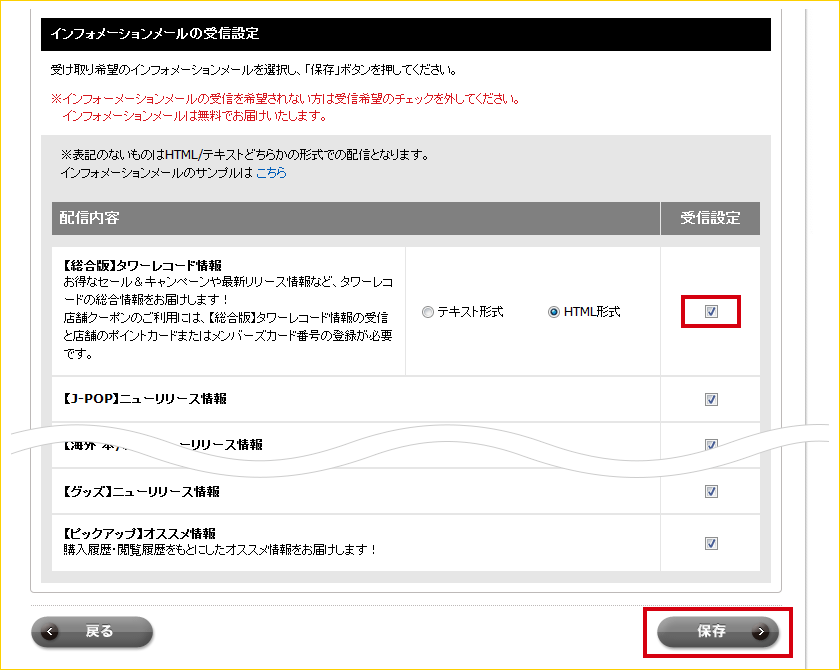 「インフォメーションメールの受信設定」から受け取り希望の「配信内容」にチェックを入れ、「保存」をクリック