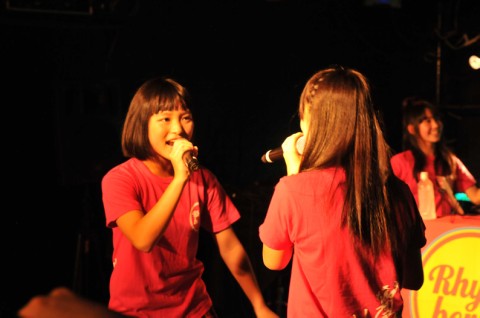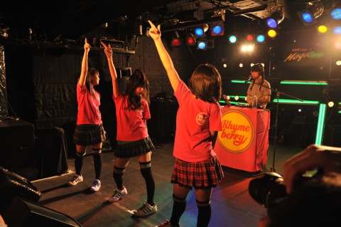 ライムベリーの母体であるガールズ・ダンス・ヴォーカル・ユニットのusa☆usa少女倶楽部に加え、その派生ユニットであるリトル☆ラビッツ、ソロ・アーティストとして活動中の保坂朱乃が出演したこの日のイヴェント。ライムベリーの4人は、挨拶代わりのナンバー“RHYMEBERRY IZ NO.1”でライヴをスタートし、2曲目の“SUPER MCZ TOKYO”で会場をもみくちゃに。その後はデビュー・シングル“HEY! BROTHER”で盛り上がりに拍車をかけ、さらにしっとりとした“WJ”と、連続で4曲を披露。その後のMCで〈T-Palette〉に参加することを発表し、年内のシングル発売、そして12月9日(日)に東京・品川ステラボールで開催されるイヴェント〈T-Palette Records 感謝祭2012〉に参加し、レーベルメイトとなるバニラビーンズ、Negicco、LinQ、しず風&絆~KIZUNA~、lyrical school、アップアップガールズ(仮)と競演することをファンに報告しました。