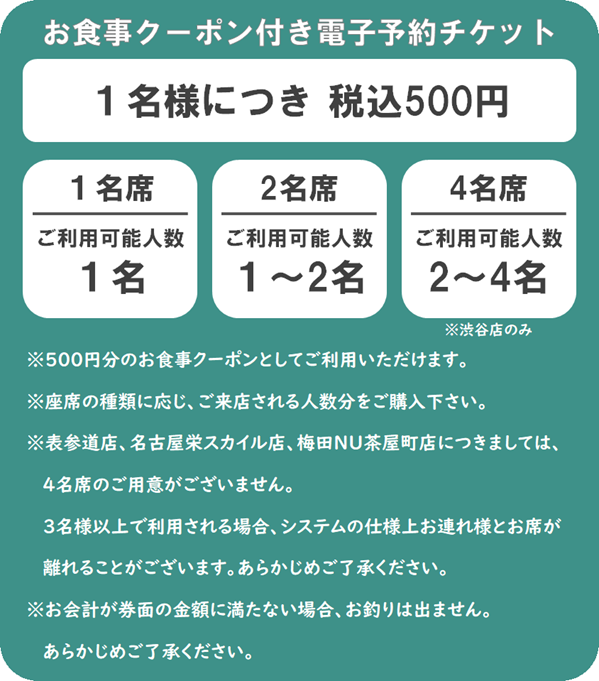 ・予約チケットはお食事券付となっておりますが、ご飲食代がお食事券の金額よりも少額であった際、差額の返金ならびにお釣りはお戻しできません。