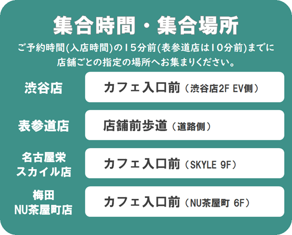 ご入店時間の15分前/表参道店のみ10分前までに券面に記載の当日入場待機列へお集まりください。