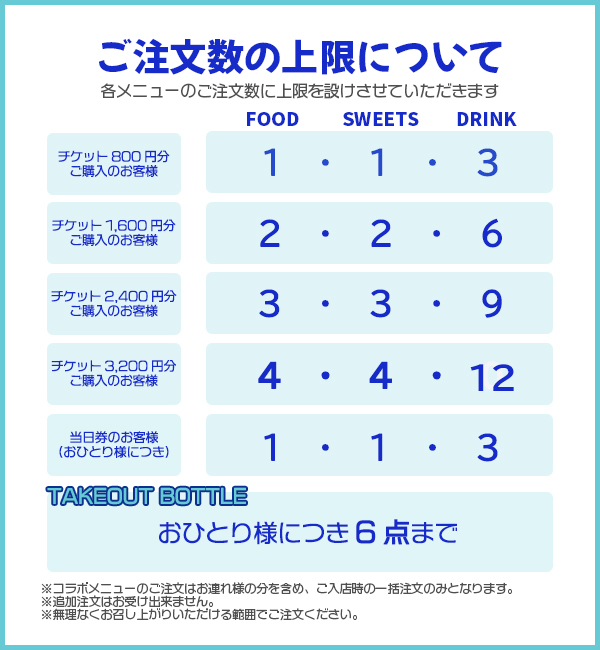 ※券面に記載の座席番号順に入場前の整列/メニューのご注文/入場/グッズ購入を受付いたします。