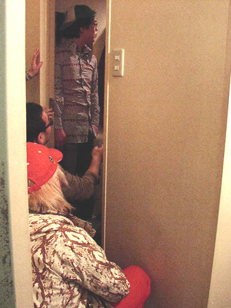 最初の撮影は、なんとトイレにRISINGTONES&猫さんで計8名入って行うことに。人が一人通れるぐらいの通路スペースから、カメラマン平間さん&ディレクター箭内さんが撮影。メイキングカメラも脇から手を伸ばして、中の様子を激写。トイレとは思えないほど図になる?というか猫さん、本当にパンツ脱いでますっ!「ニャー!」「ニャーッ!」「ニャー!!」と皆で猫さんのネタをやる息ピッタリの声に、外のスタッフも爆笑。