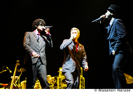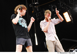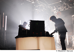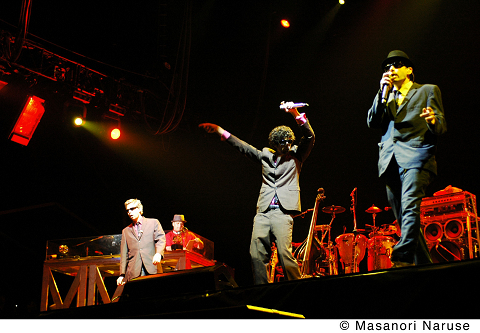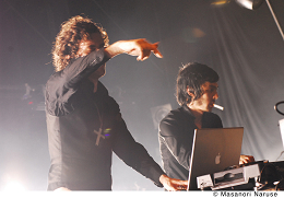 いよいよ〈WHITE STAGE〉の大トリ、BOOM BOOM SATELLITES! 会場は踊る気満々な観客の熱気でパンパンに膨れ上がっている。最新作『On』のテイストそのままに骨太ストレート。二人でステージ中央に出て客を煽りまくったりと、ここんとこの彼ら、かなりロックです。昔みたいなバキバキなブレイクビーツと文化系的な堅さがよかったんだけど……と、往年のファンとしては少々複雑な思いもあったものの、その変化が彼らの強い信念に裏打ちされたものだと実感し、納得。特にヴォーカリスト・川島の存在感が光る。やっぱりカッコイイ。目にも耳にも一分の隙もない。ここまで手堅いとかえって単調に感じたりしそうなものだが、そこはさすがに歴戦の勇士、フロアで鍛えた貫禄をこれでもか!と見せつけた。アンコールは今や定番“Dress Like An Angel”~“Ghost And Shell”。ひときわ大きな歓声に包まれ、颯爽と引き上げた彼らは、一段とたくましく見えた。*小田