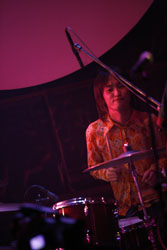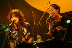 小西がステージ上から去ると、ライヴは“118”でひとつのクライマックスを迎える。アルバムでは吉澤とtoeの柏倉隆史とのツイン・ドラムで臨んだインストゥルメンタルだが、今回のライヴ・ヴァージョンでは、吉澤の生ドラムに対して岩崎がドラム・パッドで拮抗。サンプリングされた多種多様な〈音〉がことごとくリズムと化し、エネルギッシュな空間を築き上げてゆく。途中、ベース・ソロのあいだに吉澤と岩崎が入れ代わるという離れ業も披露し、プレイはどこまでもファンキー&アグレッシヴに加速。いよいよ絶頂へ達したかと思った瞬間、“Me And My Love”で一気にサイケ・モードへスイッチし、どこかハンドメイドな風合いのブレイクビーツ“アンテナ”、彼ら随一のエモーショナル・アシッド・フォーク“RAIN/THAT/SOMETHING”と、休む間もなく駆け抜ける。