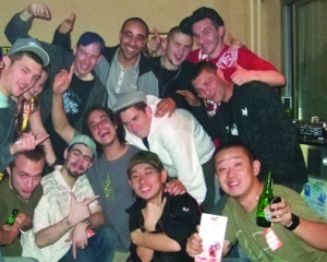 フランスはリヨンにて。この前の春に行ったツアーで、ここリヨンでのギグの後、朝方にDJフライ(俺の左隣の水色)の家に遊びに行った時の一枚。みんなで爆音スクラッチ・セッション。言葉が違えど、この瞬間は笑顔の会話を交わしている時。全員いい笑顔してるでしょ。フランス人は本当にみんな個性的でいい奴ら。そして、なんつってもパーティー好き! このあと5日間連続で、フランス中とイギリスを巡る日の初日だったのに、いきなり日の出までパーレイ。そんで、こないだ9月に行われたDMC世界大会で、このフライが優勝したのです。〈優勝〉と漢字で書かれているテクニクスの〈金のターンテーブル〉は、今年フランスに渡りました。フランス人には日本人ぽい感性もかなり感じる。今度の11月もリヨンでDJしてきます!