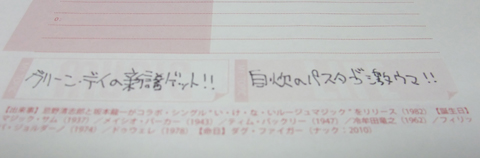 最初に言っておくと、まだ手帳本体の完成版が届いてないので、写真は印刷見本です……(泣)。それはさておき、この〈MUSIC〉と〈LIFE〉のメモ欄、今年のタワレコ手帳にとって非常に重要な要素になっているんです。〈日めくりカレンダー〉に必ず存在するスペースなのですが、その日にあった自分のトピックを書き込むメモ欄として活用していただきたい!という、われわれ制作スタッフの願いが込められております(大げさ?)。例えば……