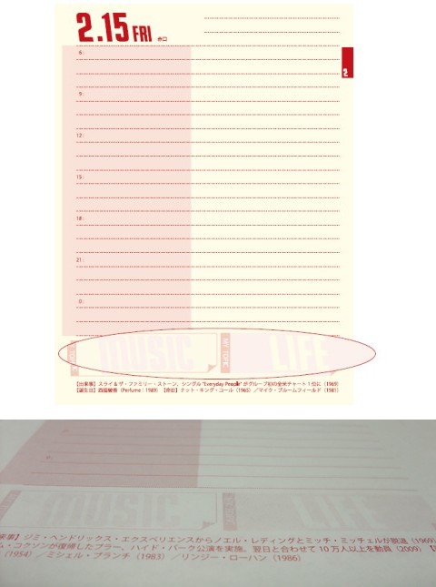 第2回では、1日1ページの〈日めくりカレンダー〉に載せてある音楽関連の〈出来事〉と著名なアーティストの〈誕生日〉〈命日〉についてご紹介しましたが、今回は、そのすぐ上に設けた〈MUSIC〉と〈LIFE〉のメモ欄について。まずは↓の画像をご覧あれっ!