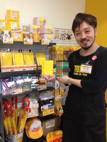 ドドーン!と展開中!! お会計にいらっしゃったお客さまの反応をチラチラと見て見ぬふりしてみたのですが、やはり手帳カバーが気になっている方が多いようです(特に青と白のストライプ柄!)。しかし、残念ながら手帳お買い上げの瞬間には立ち会えず……(泣)。とはいえ、実際の〈タワレコ手帳〉がお店に陳列されているところを見ただけで、若干の感動が。そんな思いにふけっていると、スタッフへの取材の時間になりました。今回インタヴューを受けてくれたのは、町田店の切通(きずし)店長です!