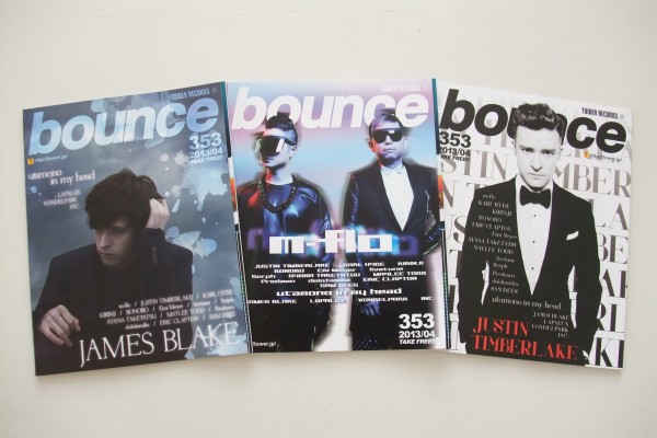 はい、タワーが発行しているお馴染みのフリーマガジン、〈bounce〉です。ただいま配布中のこの353号は、待望のセカンド・アルバム『Overgrown』を日本で4月10日にリリースするUKの人気アーティスト、ジェイムス・ブレイクと、ゲスト・ヴォーカリストに関する情報をあえて非公開としている最新アルバム『NEVEN』が話題のm-flo、約7年ぶりの新アルバム『The 20/20 Experience』を発表したジャスティン・ティンバーレイクが表紙を飾っています。ということで……