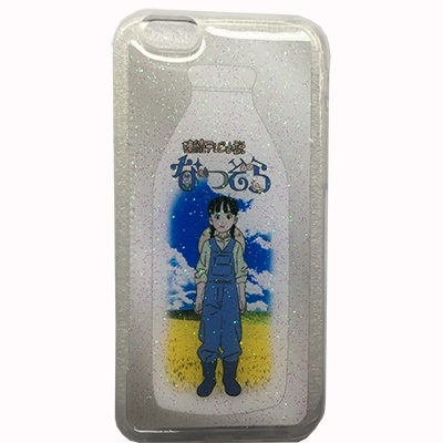 透明のiPhone用カバー。牧場とロゴを背景に、番組オープニングの少女アニメのデザイン。表面デザインにラメ入り。