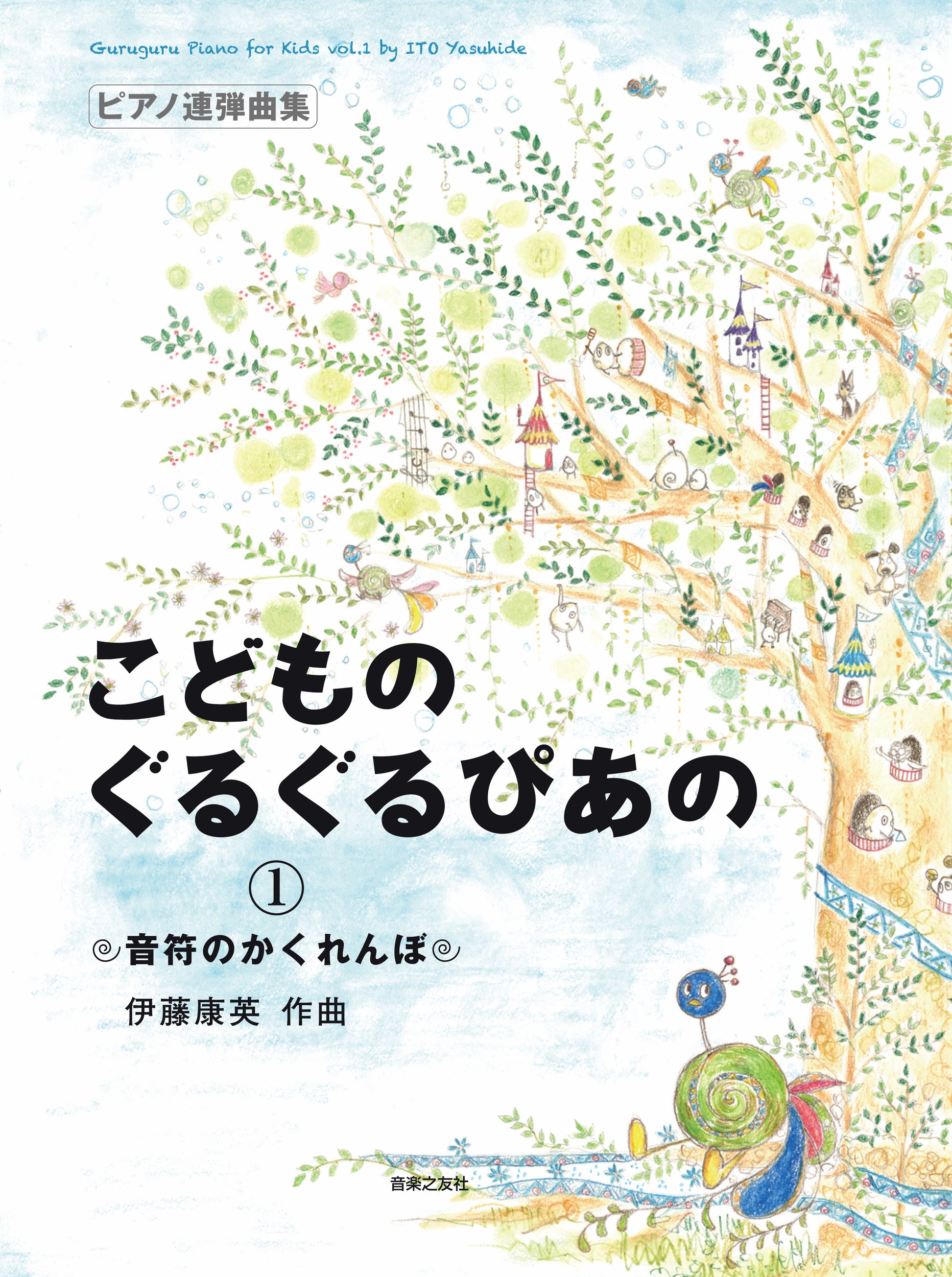 ピアノをはじめたばかりの子供でも楽しめる曲集。楽譜が読めなくても大丈夫。たった1音を弾くだけで先生と連弾することができる。鍵盤図をもとに「ド」を探して、さらに、いろいろな音域の「ド」をわたって大移動!2音で弾ける曲やシンコペーションなど少し複雑なリズムを含む曲も充実している。導入期だからこそ、先生と一緒に弾いて音楽の流れにのる感覚をもつことはとても重要。かわいいぐるぐるどりのイラストが子供たちを愉快な音楽の世界へいざなう。