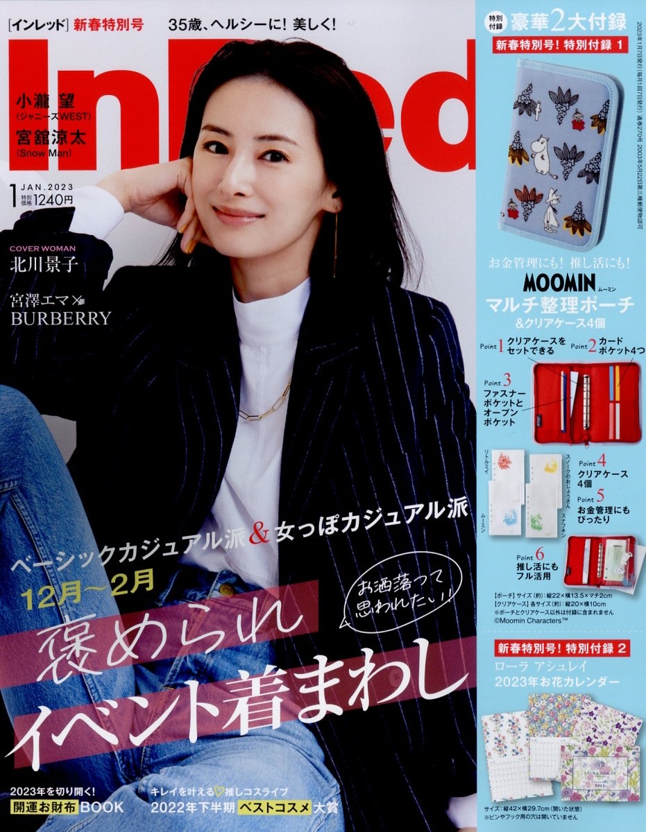 特別付録1 MOOMIN マルチ整理ポーチ&クリアケース4個/特別付録2 ローラアシュレイ2023お花カレンダー/「お洒落」って思われる真冬の見回し服