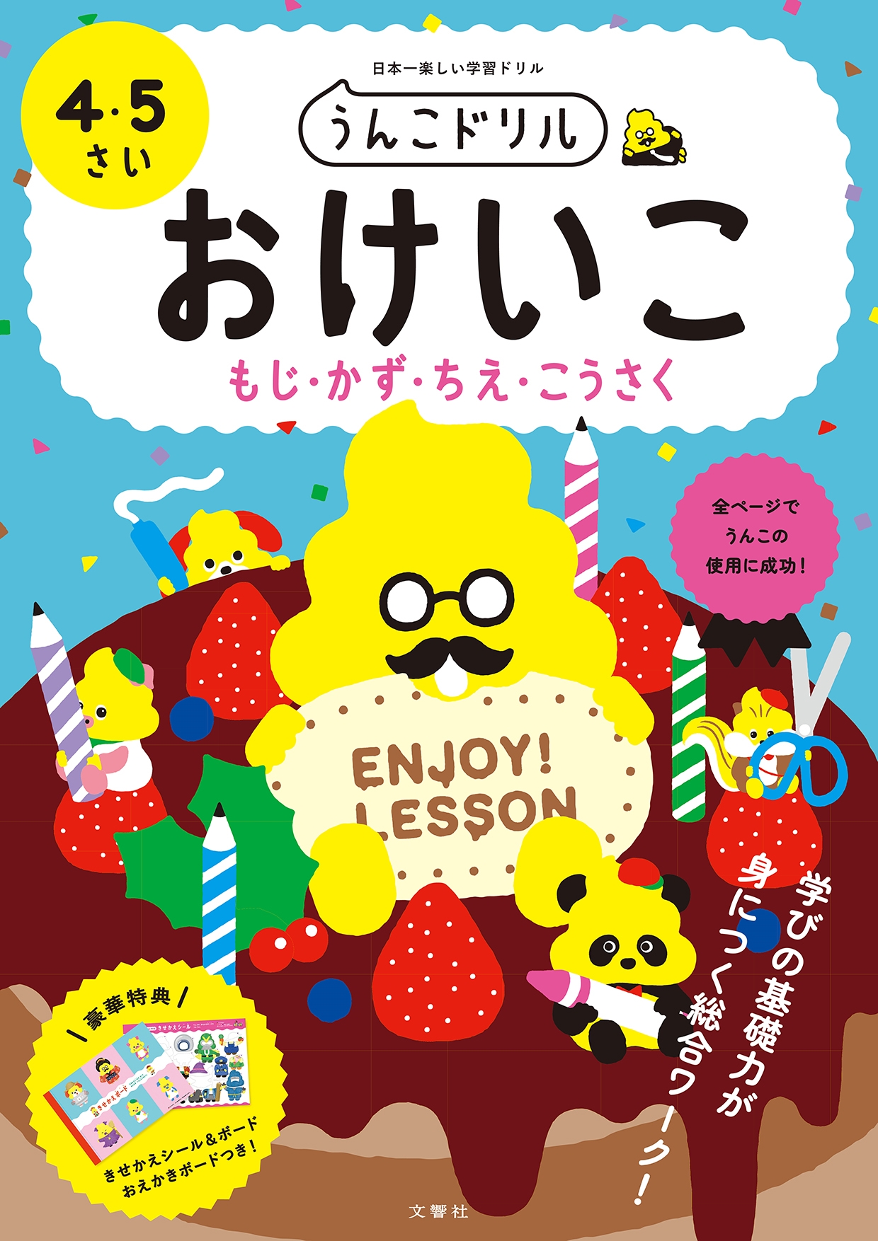 かわいらしいうんこキャラクターといっしょに楽しく総合的なお勉強ができる知育ドリルです。