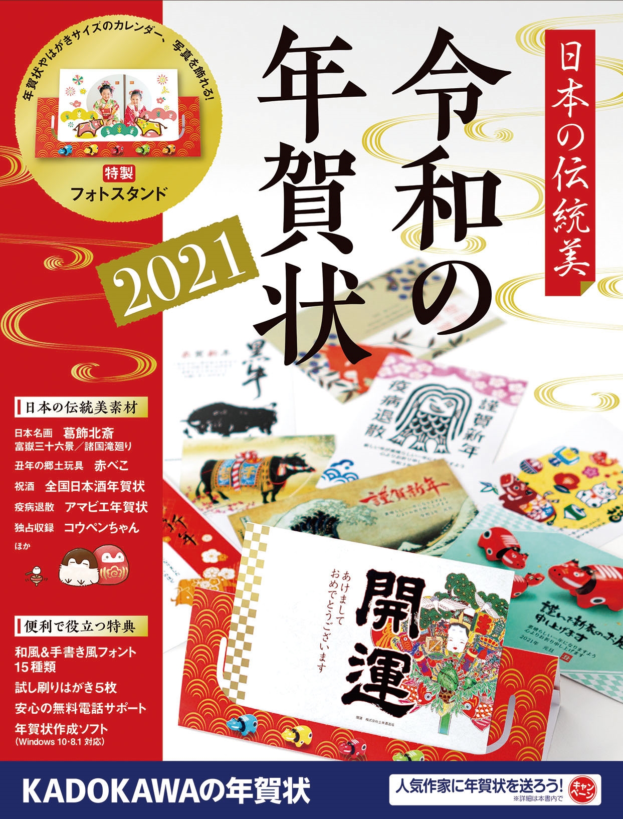 スペシャル特典として、年賀状やはがきサイズの写真、カレンダーが飾れる特製スタンド付き。いただいた年賀状を飾るのはもちろん、収録されている写真フレームやカレンダーでオリジナルのインテリア小物を作成できます。