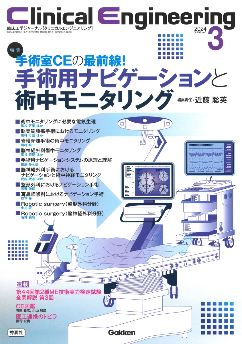 術中の部位診断として近年欠かすことのできないナビゲーションシステムとモニタリングに関して、手術室に勤務する臨床工学技士が理解しておくべき、基礎的な技術・実臨床での応用など、この分野に関する最新の知見を紹介。