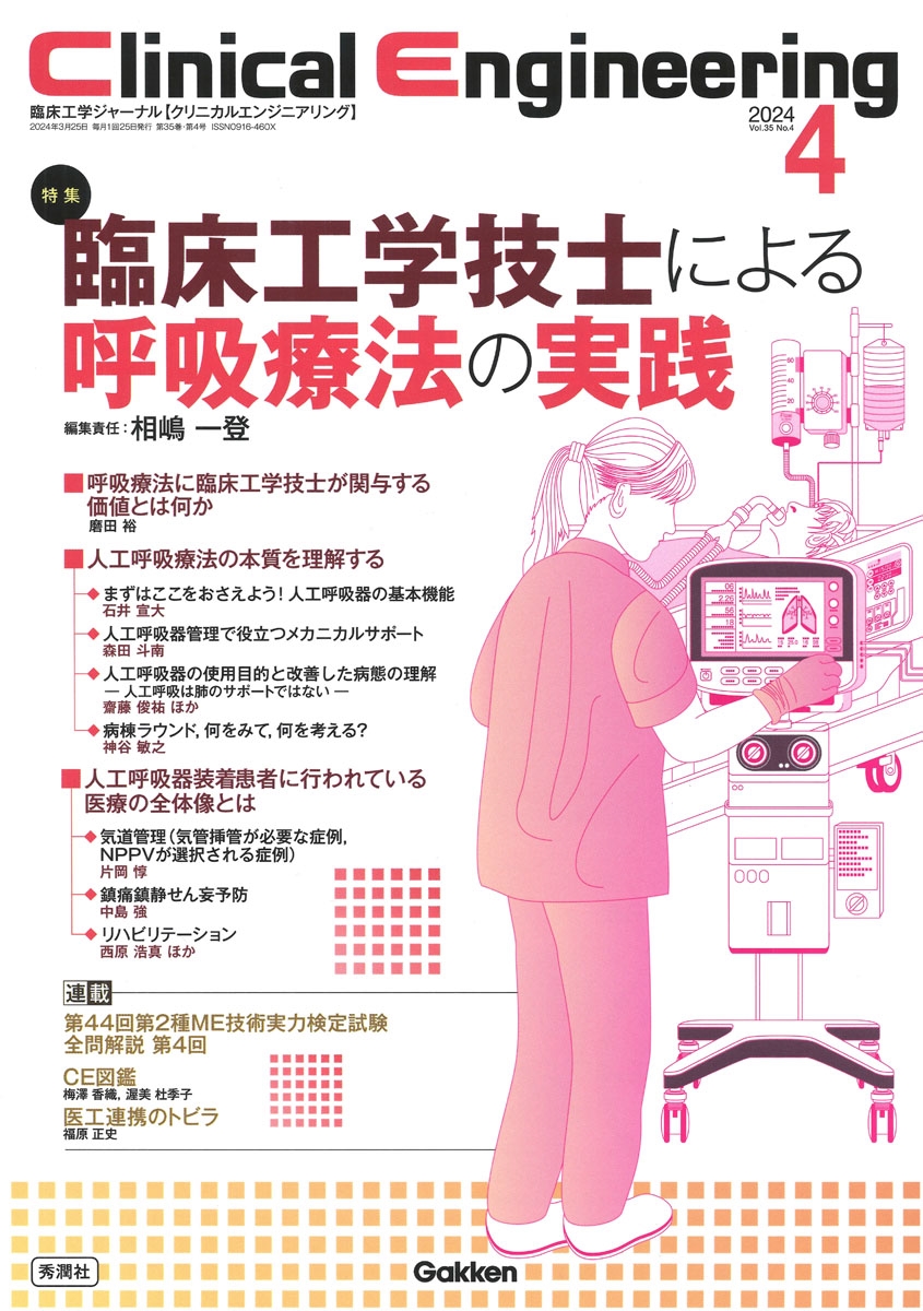 人工呼吸器の安全性確保とともに、治療効果の最大化を狙うことは臨床工学技士の責務である。本特集では、呼吸療法関連機器に加え、呼吸療法を受けている患者の全体像を理解するため、関連する病態生理や治療介入について幅広く解説!