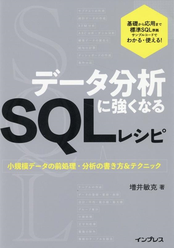 本書では、中小企業でよくある、数百件から数万件程度の小規模なデータを想定し、それらデータの前処理や分析を行なうSQLの書き方やテクニックをレシピとしてまとめています。データの前処理を中心に、合計や平均、最小値・最大値の計算、小数処理、グループ集計、重複除外、日付・文字列処理、条件分岐などの基本的なSQL操作から、複数テーブルの結合やサブクエリ、外れ値・欠損値処理、データの分布調査、RFM分析やアソシエーション分析などの応用的な技術まで、実用的なサンプルコードとともに徹底解説しています。