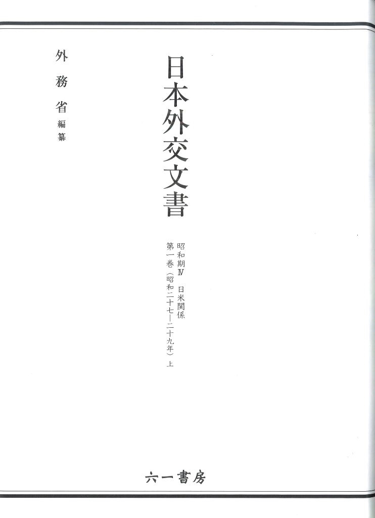 太平洋戦争終結に至るまでの昭和期(昭和2~20年)の外交文書は、昭和期1~3に分けて編纂・刊行を終えたが、これに引き続く時期区分として昭和期4(昭和20~35年)を設定する。このうち、サンフランシスコ平和条約シリーズ(全3巻)、占領期シリーズ(全3巻、関係調書集)、国際連合への加盟および日華平和条約については特集として刊行済みである。本書は昭和期4日米関係の第1巻として、昭和27年の対日平和条約発効から29年末までの日米関係につき主要な関係文書を収録した。