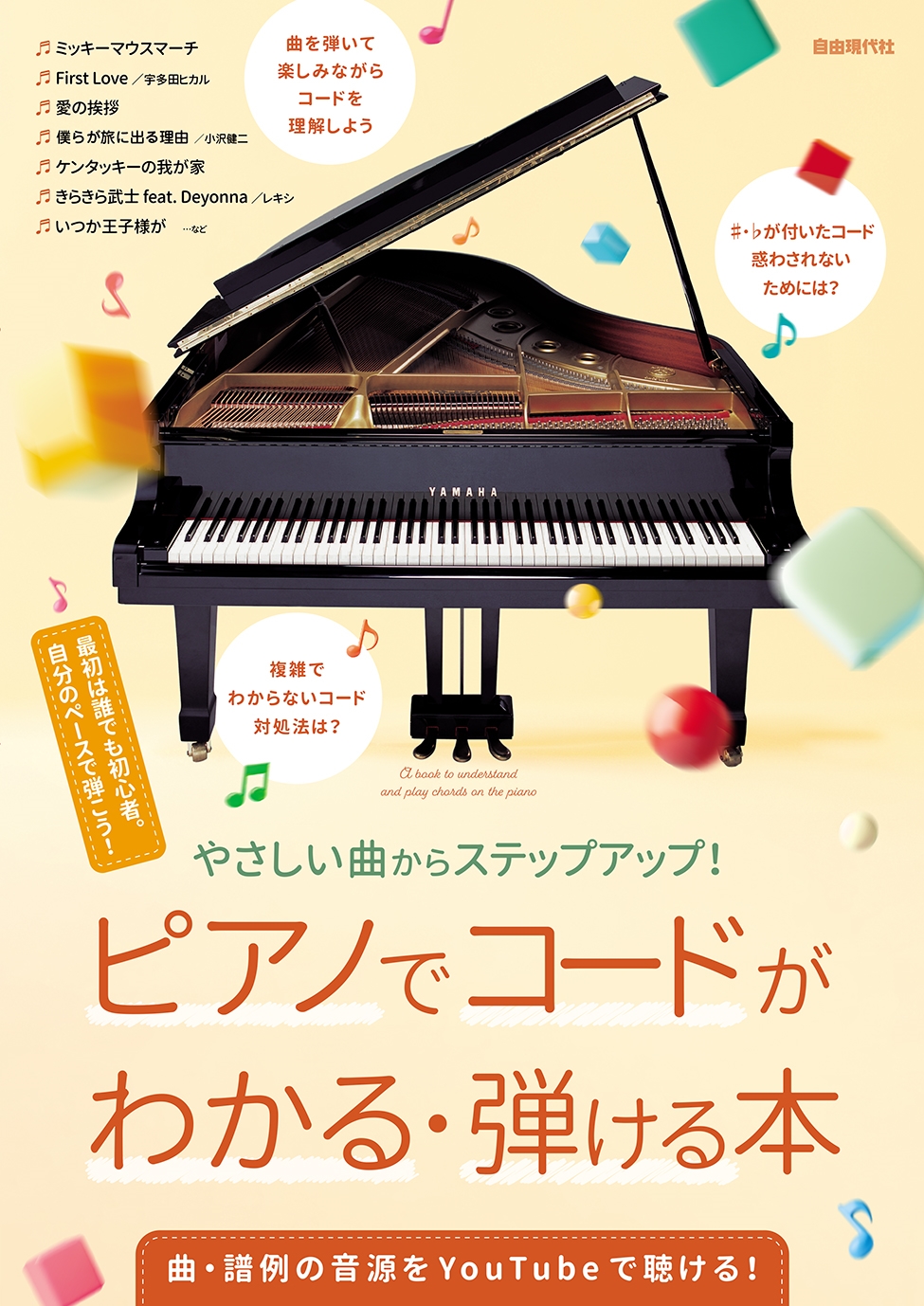 五線譜の上に書かれたコードを見て、ピアノですぐに弾けるように解説していく教本。コードの数が少ない曲から徐々に増やしていくので、無理なく練習できる。