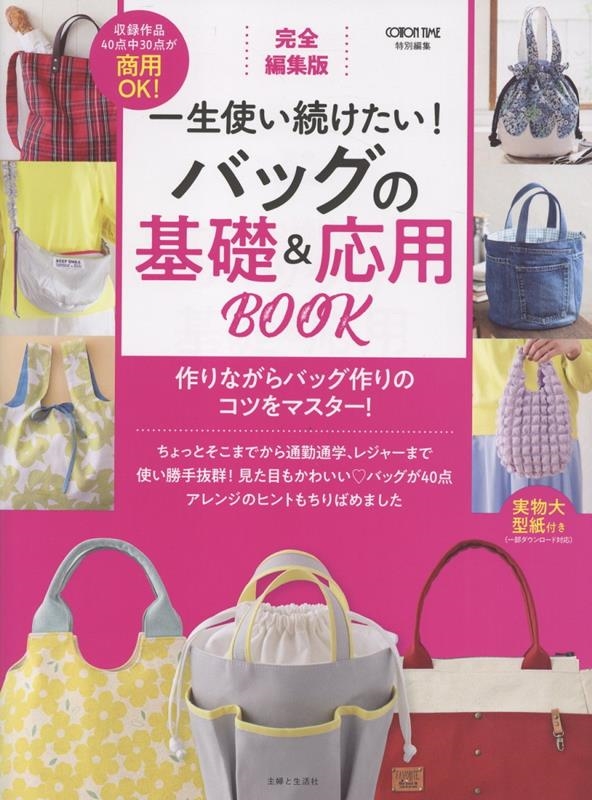 さまざまなバッグを作りながらバッグ作りの基礎をマスター! まちの縫い方、円形と側面の縫い方など、写真で解説しながらご紹介しています。好みでアレンジできるよう、さまざまなポケットのつけ方や、持ち手のアイデアもご紹介。自分らしくカスタマイズできるヒントもちりばめています。Part5のアレンジ作品は、実用的なバッグから、フリルやギャザーであしらいをプラスしたおしゃれなバッグまで、バラエティ豊富に30点掲載。実物大型紙はページ内に掲載されている作品と、ダウンロードでプリントできる作品があります。ページ内の型紙は写しやすく、ダウンロードの型紙はプリントしたらカットしてそのまま使えるので便利です! 掲載作品40点中30点が商用OK!です。