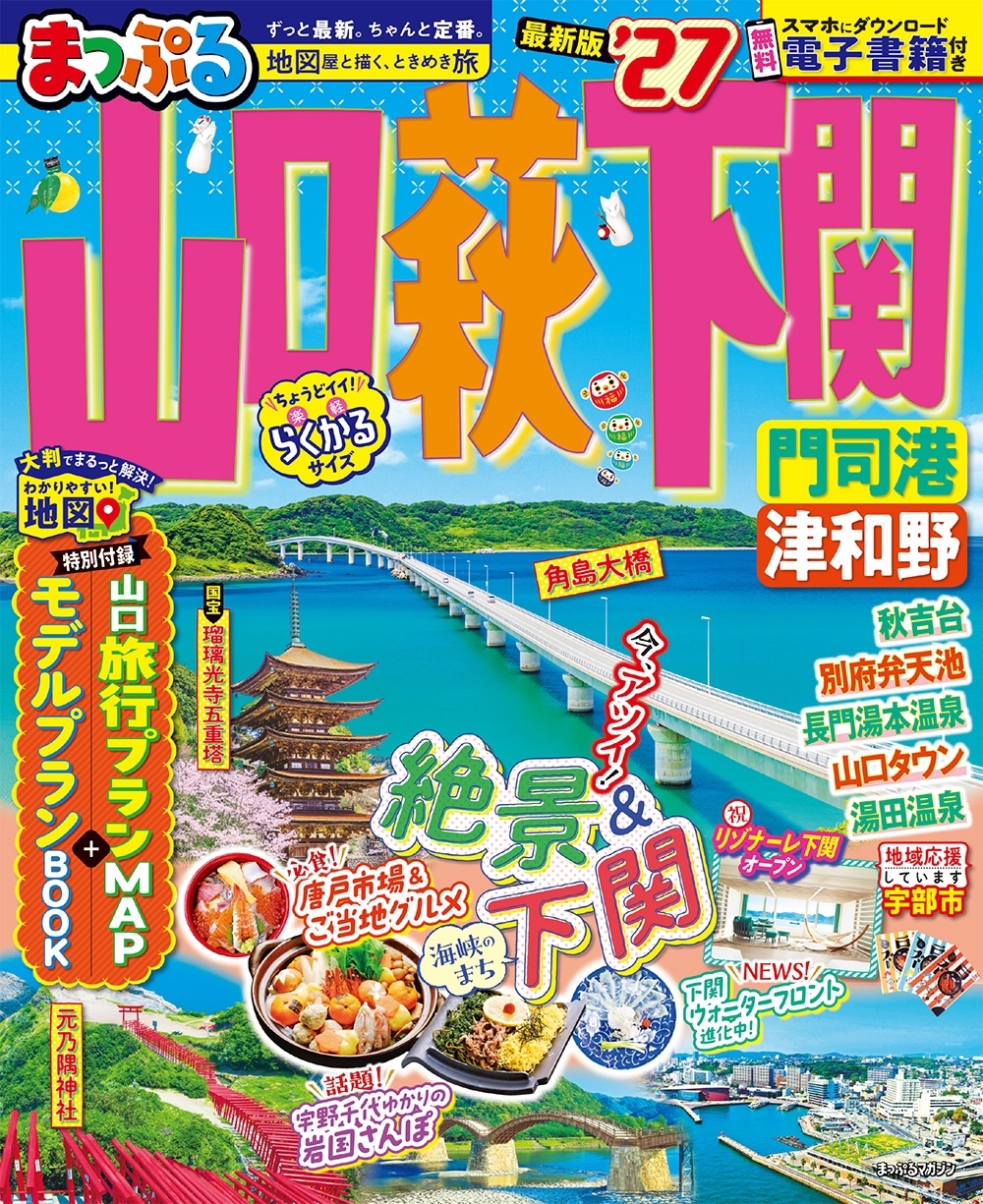 話題のニュースが目白押しで今アツイ山口へ!開発が進む下関をはじめ、26年秋の連続テレビ小説で注目の岩国、県内全域で開催される山口デスティネーションキャンペーンなど、最旬の山口旅を巻頭大特集。絶景スポットの「角島大橋」「元乃隅神社」「秋吉台・秋芳洞」のほか、人気の「唐戸市場」や「門司港」などもクローズアップ。萩や長府、津和野など歴史ある見どころもわかりやすく紹介。ふぐや海鮮グルメなどのご当地グルメも充実!